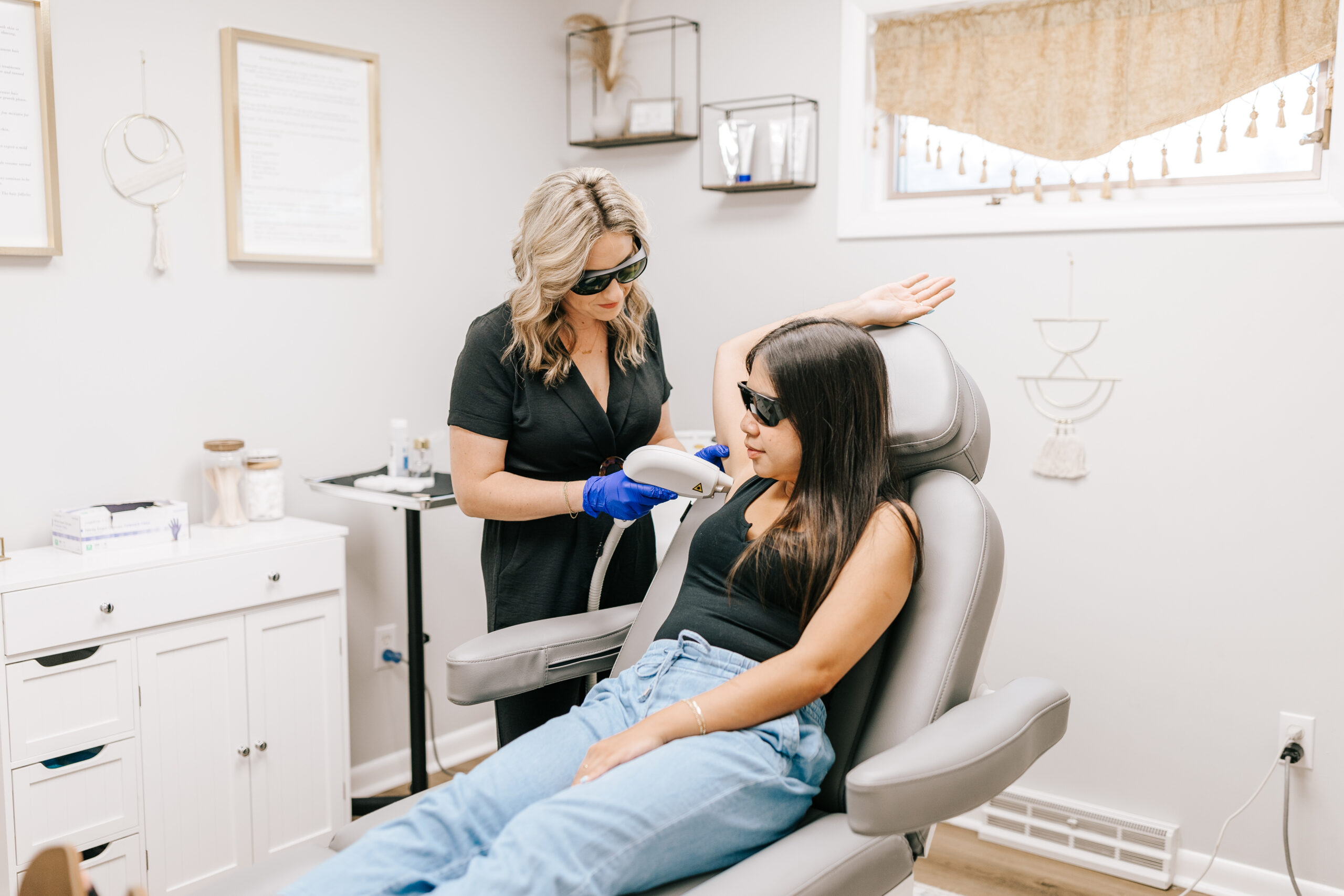 During treatment, you will wear protective eyewear. The laser handpiece delivers pulses of light that feel similar to quick snaps or warmth. Most clients describe the procedure as tolerable and brief.